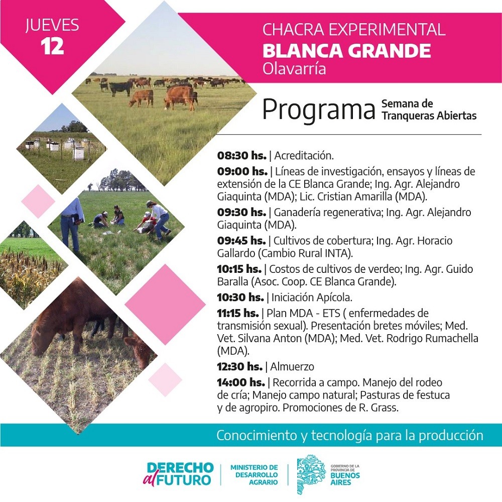 Este jueves 12 de octubre la Chacra Experimental Blanca Grande abrirá sus puertas a todas y todos aquellos interesados en conocer los trabajos de investigación e innovación científico-tecnológica y los ensayos vinculados a la producción ganadera, agrícola, agroecológica y apícola que se llevan adelante en el predio de la misma, ubicado en Ruta n° 226 Km 360, partido de Olavarría.